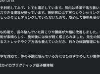「こちらの整体院を利用してみて、とても満足しています」とGOOGLEでレビューをいただきました。ありがとうございました!