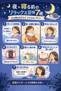 たとえば夜眠る前に軽いストレッチをする、お風呂に入る、瞑想をする、深呼吸をしてみる、好きな音楽を聴いてみる、アロマをたく、ハーブティーを飲んでみるなど。