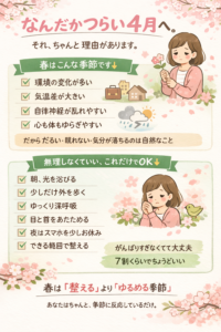 あなたが今感じている不調は、決して努力不足によるものではありません。むしろ、変化に適応しようと健気に支えてくれている、あなたの体からの大切なサインなのです。まずはその心の重荷を下ろすことから、春のセルフケアを始めましょう。